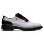 The GLCO x FootJoy Tarlow is a champion of rakish golf style preferred by golf trend-setters like Justin Thomas, Ian Poulter and Billy Horschel. Like the Packard, this artistic cap toe design features premium, hand selected, full grain leather and luxurious calfskin details as well as the VersaTrax+ outsole configuration. However, the signature GLCO patent leather Tortoise print runs the length of the eye stay and pops on the heel counter to deliver a dramatic and elegant statement.