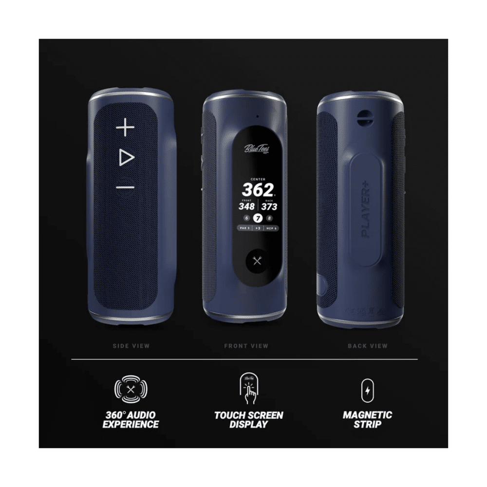 The Player+ is a revolutionary GPS touch screen golf speaker powered by the Blue Tees Game App, offering access to over 40,000 courses with visual and audible distances. Featuring deep bass, Links Party Pairing, dual pairing, a magnetic strip, a built-in power bank, and an IPX7 waterproof rating, it delivers an unmatched on-course experience. Available in Black and Navy.